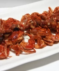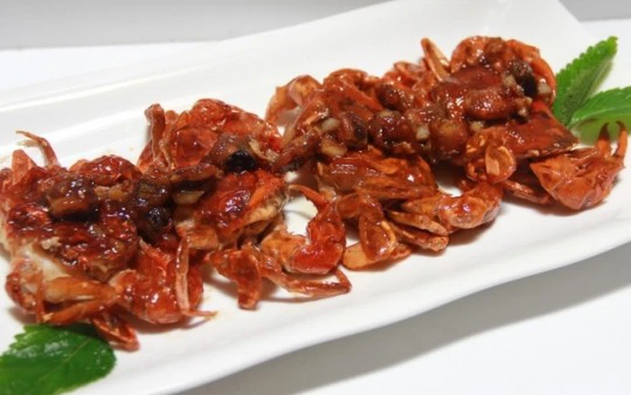 - Sau đó đem chiên trong chảo dầu sôi với lửa vừa phải. Vớt cua ra để ráo dầu, trang trí vào dĩa, tỉa rau củ để trang trí. Dùng khi còn nóng rất ngon, chấm với tương ớt thì tuyệt vời.